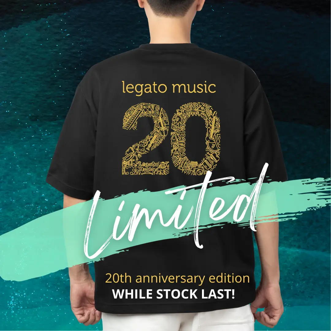 Celebrate Legato Music’s 20th Anniversary in style with our exclusive concert T-shirt! This simple yet elegant design features a gold print on a choice of classic white or sleek black fabric. Available in a wide range of sizes, don’t miss out on this limited edition T-shirt! Place your pre-order before September 15th to secure yours.